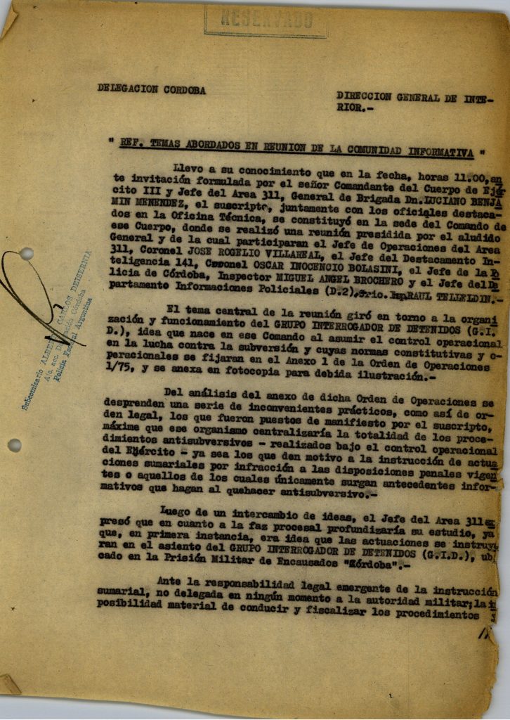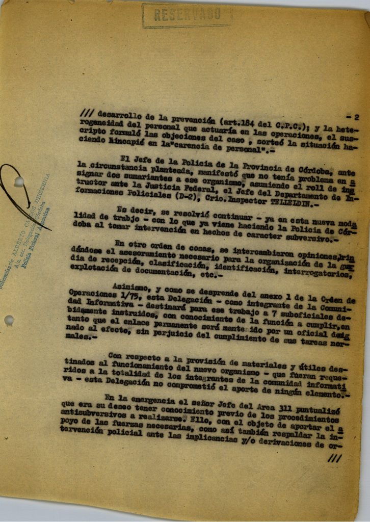 Esta pieza de archivo manifiesta las lógicas represivas al interior del sistema democrático como mecanismo de legitimación en el ejercicio de la violencia estatal, hasta el punto de llegar a la destrucción de esos mismos gobiernos constitucionales. La necesidad manifiesta de “organización y funcionamiento del grupo interrogador de detenidos” (…) para la concreción de la “lucha contra la subversión” da cuenta de un despliegue de mecanismos y de la utilización de instituciones del Estado que se consolidarán meses posteriores con la asunción de las tres fuerzas militares luego del golpe de Estado del 24 de marzo de 1976. Sumado a esto, el documento destaca la necesidad de proveer más recursos a la Policía, considerada una de las instituciones centrales en el accionar estatal.En este marco, se profundizó la coordinación entre todas las fuerzas de seguridad y se señaló que el D2 debía continuar con las tareas antisubversivas que ya llevaba adelante. Aunque en este nuevo periodo el III Cuerpo ocupaba el lugar de mayor poder, asumiendo la responsabilidad sobre todas las operaciones.