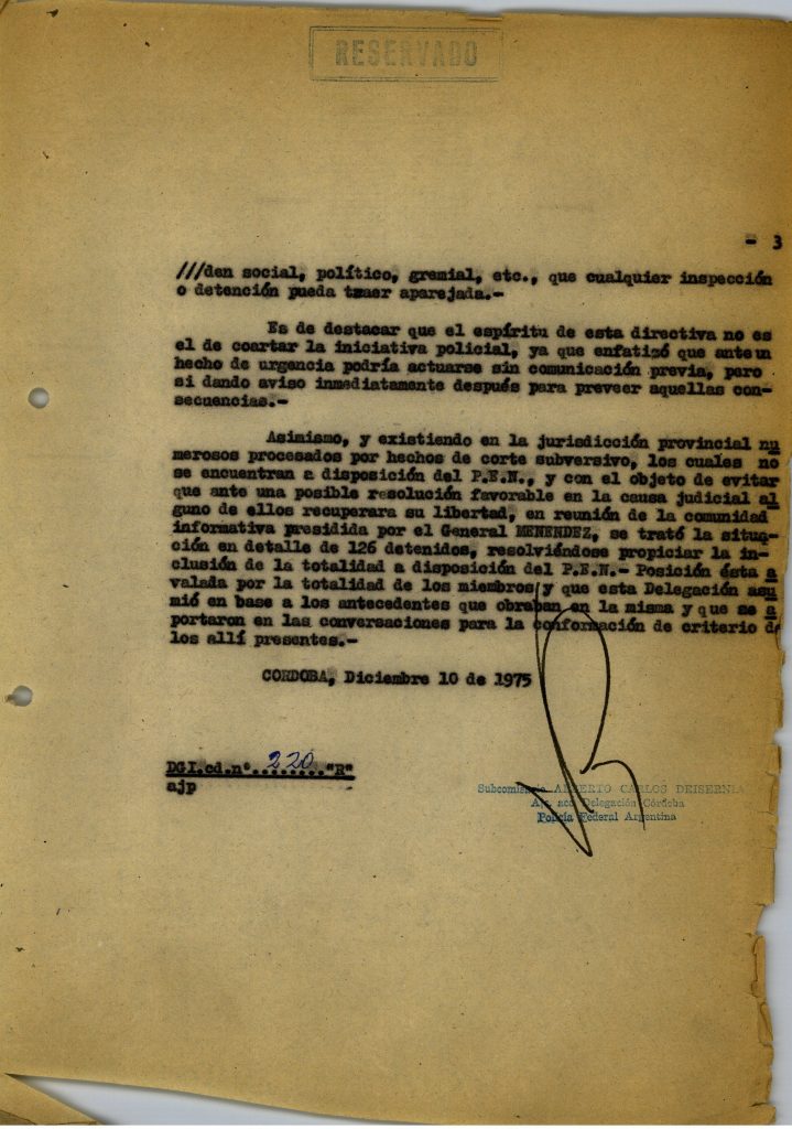Este documento forma parte de la Serie «Memorandums» del Fondo de la Policía Federal, Delegación Córdoba, resguardado en el Archivo Provincial de la Memoria. Esta comunicación reservada del 10 de diciembre de 1975 se inscribe en un contexto nacional de incremento de las acciones represivas por parte del Estado, luego del 5 de febrero de 1975, con la publicación del decreto S 261/1975, en el cual el Ejecutivo Nacional ordena que el Comando General del Ejército “procederá a ejecutar las operaciones militares que sean necesarias a efectos de neutralizar y/o aniquilar el accionar de los elementos subversivos que actúan en la provincia de Tucumán”. Este proceso abierto en Tucumán se extendió a todas las provincias. En Córdoba, meses más tarde, con la llegada de Luciano Benjamín Menéndez al mando del III Cuerpo del Ejército, en coordinación con el responsable de la Policía, Raúl Pedro Telleldín, se amplió un escenario propicio para el despliegue de esta política. Aunque cabe destacar que el avance de la persecución, la represión y la violencia estatal fue precedida por la conformación específica del D2 a principios de los años ‘70, y se vio exacerbado con el golpe policial ocurrido en nuestra provincia a fines de febrero de 1974.