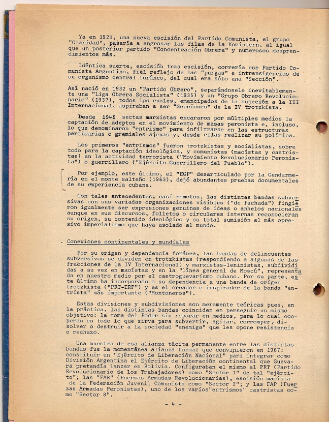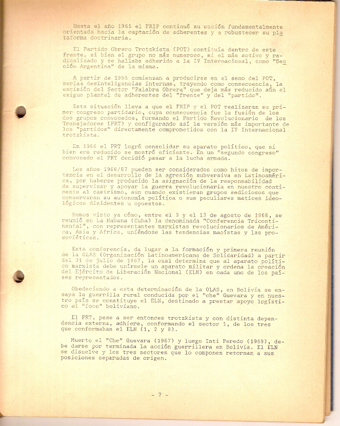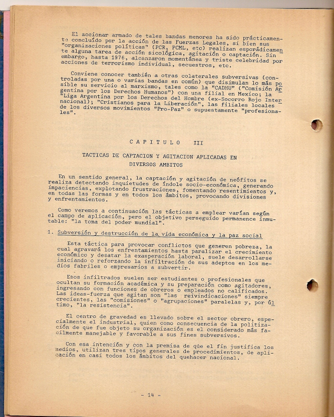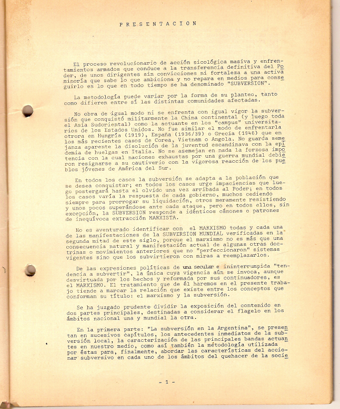 El movimiento obrero argentino fue uno de los sectores más perseguidos y golpeados por la represión, en represalia a su gran capacidad de organización y lucha contra las dictaduras de turno. El Cordobazo (1969) marca, en este sentido, un hito incuestionable del enfrentamiento entre las fuerzas obreras y la maquinaria de represión de Estado oligárquico. Sin lugar a dudas, el 24 de marzo de 1976 es un punto de inflexión y determina la puesta en marcha de la fase más profunda y sistemática del proyecto aniquilador. Pero trabajar sobre el eje “movimiento obrero y represión” nos obliga a mirar más atrás e intentar una comprensión más acabada de la historia de la lucha de los colectivos de trabajadores y la evolución de las teorías y prácticas que tendieron a su control y exterminio. En esta oportunidad invitamos a la lectura de fragmentos de un documento producido por el Ejército, denominado “MARXISMO Y SUBVERSIÓN, Ámbito Laboral”. Este material fue utilizado como manual de formación en escuelas militares durante la década del ‘70. El capítulo IV está dedicado a describir y analizar el “Accionar (subversivo) en los ámbitos empresario y gremial”. A partir de este documento se puede indagar sobre el modo en que los militares observaron, evaluaron y construyeron al movimiento obrero como enemigo a aniquilar. Es notable el hincapié puesto en el desmantelamiento de la movilización y de la politización en los ámbitos laborales, el temor a la masa que “busca subvertir el poder”. “No es aventurado identificar con el MARXISMO todas y cada una de las manifestaciones de la SUBVERSIÓN MUNDIAL verificadas en la segunda mitad de este siglo, porque el marxismo no es más que una consecuencia natural y manifestación actual de algunas otras doctrinas o movimientos anteriores que no “perfeccionaron” sistemas vigentes sino que los subvirtieron con miras a reemplazarlos.” (p. 1) En sus páginas realizan una descripción e historización detallada de cada una de las organizaciones que denominaban “bandas de delincuentes subversivos” (a los fines también de hacer la descripción de la evolución del pensamiento marxista en nuestro país). Al momento de enumerar los objetivos de estas “bandas”, uno de los considerados más preocupantes era: “Implantar una democracia proletaria basada en el sistema de ‘diputados’ obreros…” que apuntaba también a “‘Socializar’ la economía, aboliendo la propiedad privada de los bienes de producción, comercio, etc.” (p. 9). O “Necesidad de preparación sistemática del proletariado para capacitarlo a adoptar una franca postura de lucha por el poder” (p. 21). Por otra parte presentan un balance del estado de la lucha obrera previa y posterior al 24 de marzo, haciendo un llamamiento a toda la sociedad para lograr la aniquilación total del enemigo que ellos sintetizan como “Marxismo”. Al respecto de la situación anterior al 24 de marzo, el documento considera: “Creada la organización de superficie se inicia una abierta política de masas, adaptando las distintas situaciones a las necesidades y aspiraciones de los obreros de la fábrica, logrando de esta manera un adecuado grado de movilidad de las masas, por lo cual una vez alcanzado un objetivo inmediatamente es generada otra situación de conflicto y así hasta la conquista del poder gremial” (p. 23) “Esta táctica para provocar conflictos que generan pobreza, la cual agravará los enfrentamientos hasta paralizar el crecimiento económico y desatar la exasperación laboral, suele desarrollarse iniciando o reforzando la infiltración de sus adeptos en los medios fabriles o empresarios a subvertir. (…) Las ideas fuerza que agitan son “las reivindicaciones” siempre crecientes, las “comisiones” o “agrupaciones” paralelas y, por último, “la resistencia”. El centro de gravedad es llevado sobre el sector obrero, especialmente el industrial, quien como consecuencia de la politización de que fue objeto su organización es el considerado más fácilmente manejable y favorable a sus fines subversivos. (p. 14) Una vez descriptas, según su mirada, las estrategias de lucha del movimiento obrero, se presenta el quiebre impuesto a partir del golpe. “A partir del 24 de marzo de 1976, con las FFAA en función de gobierno, se concibió y ejecutó una estrategia nacional que contemplara una acción integral, coherente y coordinada como condición ineludible para enfrentar con éxito a un adversario para quien el fin justifica los medios y cuya agresión alcanza por igual a todos los ámbitos del quehacer argentino” (p. 33). “De acuerdo a lo establecido en el Acta Estatuto para el Proceso de Reorganización Nacional, se suspendieron las actividades gremiales de trabajadores, empresarios y profesionales, lo que, en un primer momento, creó un vacío al no posibilitar la conexión fluida de las bases obreras con ámbito patronal y viceversa” (p. 26). Obviamente, el documento evalúa positivamente la disminución de la protesta obrera y plantea: “Los intentos de alteración del orden promovidos por determinados Cuerpos de Delegados cayeron en el vacío, evidenciándose cabal comprensión de la coyuntura histórica por la que el país atravesaba, al no reclamar aumentos masivos pese a la crítica situación económica por la que transitaba el asalariado.” Es notable que la desmovilización obrera sea atribuida a la “cabal comprensión”, cuando era resultado de la implantación del terror y la aniquilación de la dirigencia gremial combativa. Finalmente, el texto hace un llamado a la sociedad instalando la obligación de aportar a la consolidación del “proceso de reorganización nacional” mediante la aniquilación total de la subversión: “Pero es importante que tengamos clara conciencia que el exterminio del flagelo subversivo no se logra, ni mucho menos, con el aniquilamiento de su manifestación violenta. Habremos 